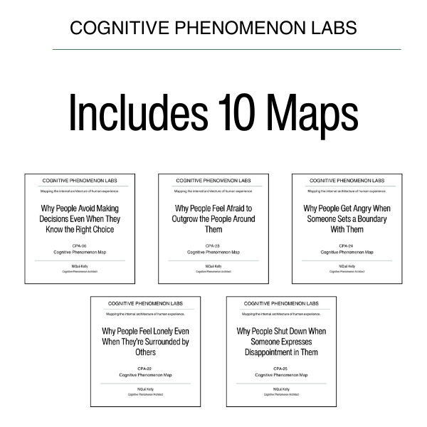 This bundle provides a structural view of how nervous-system readiness, identity exposure, emotional weight, and prediction gaps impact action. Designed in the PhenomenonLabs institute format, these maps are arranged for clarity, pattern recognition, and practical cognitive understanding. They are ideal for self-reflection, productivity insight, coaching, journaling, and behavioral analysis.